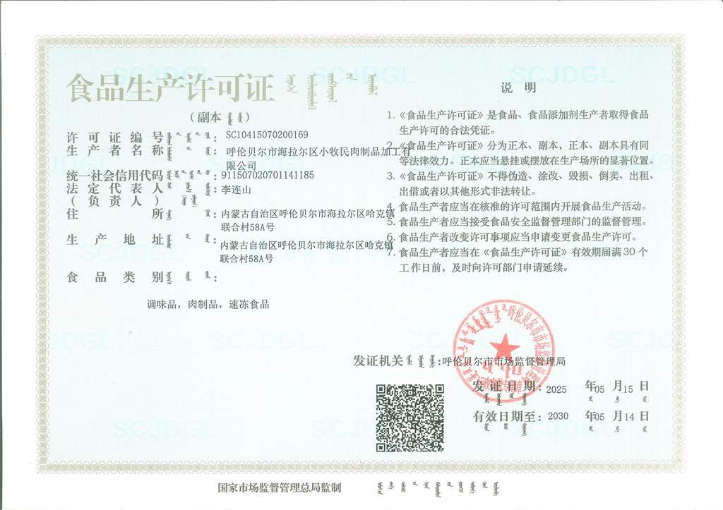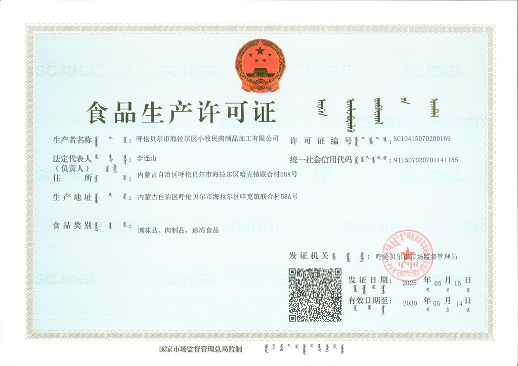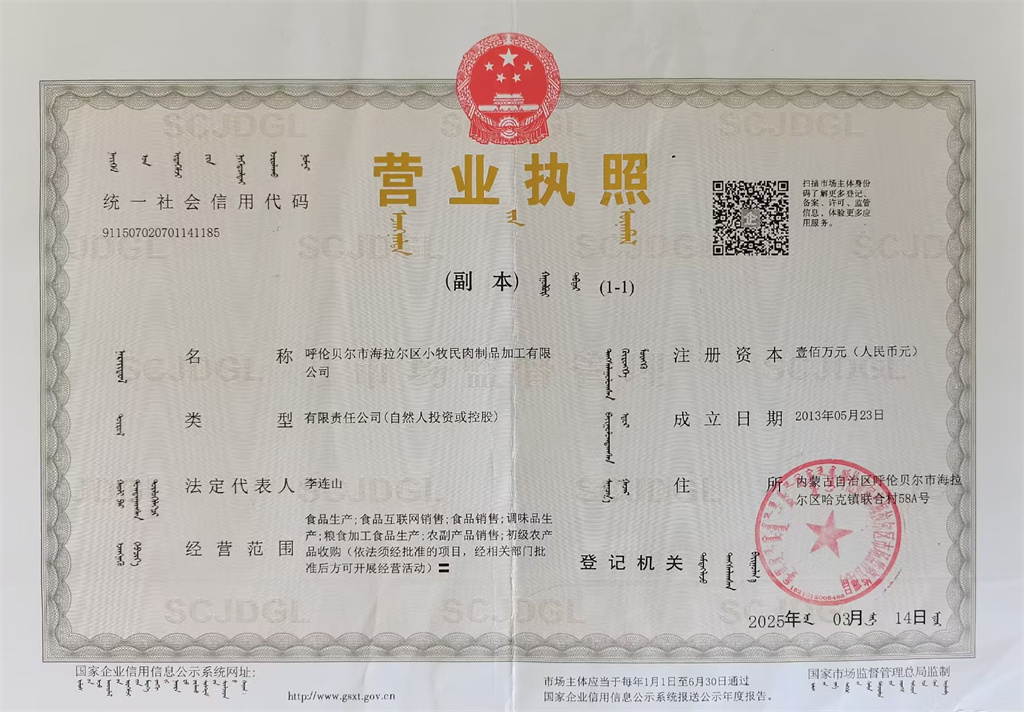 呼伦贝尔小牧民肉制品加工有限公司坐落于美丽的呼伦贝尔首府 —— 海拉尔区,公司成立于1998年,是专业生产干牛肉干的现代化企业,拥有先进生产车间及现代化生产设备,是目前实力雄厚、品种齐全、质量上乘的现代规范企业,已通过国家食品生产许可和认证。主营产品有风干肉、烤羊腿、烤羊排等。